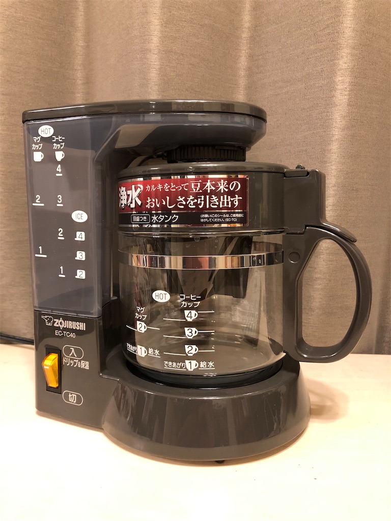 そこで、簡単にコーヒーを作れるコーヒーメーカーを使ってみることにしました。機能や味に特段のこだわりはなかったのですが、いろいろ探した結果、象印のEC-TC40に行き着きました。値段が安くて、ロングセラー製品のようです。デザインは洒落ていませんが、使い勝手は抜群で、日本らしい製品です。